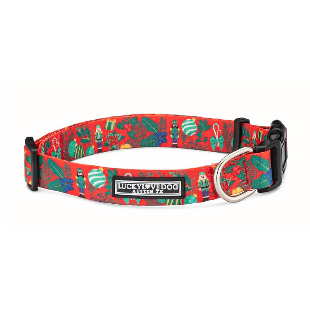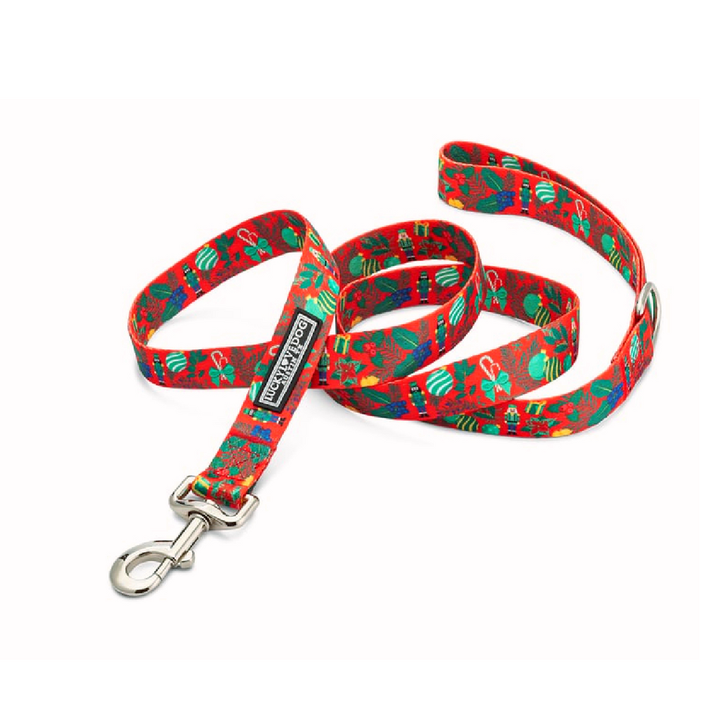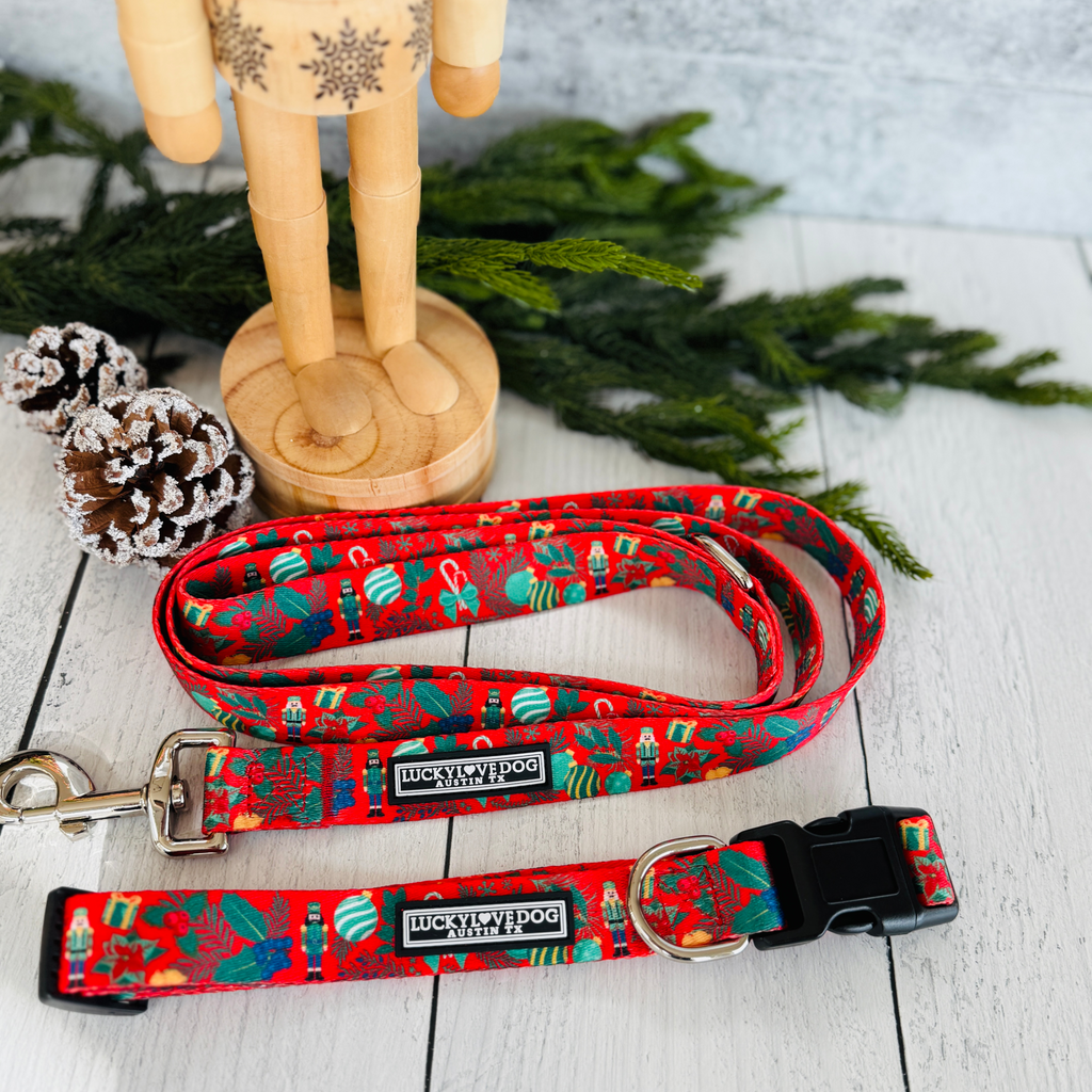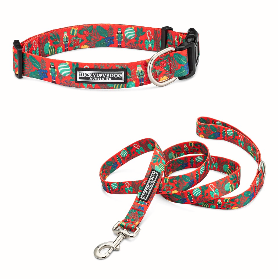 The Fritz Collar and Leash Collection — a festive Nutcracker-themed design bursting with candy canes, holly, ornaments, and wrapped gifts. Cheerful, bright, and full of holiday spirit — just like the little dog who inspired it.